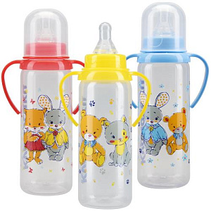 Бутылочка с ручками и силиконовой соской молочной, 250 мл - 1 шт в уп. Цвета: красный, принт - лисенок и зайка желтый, принт - мишка и котенок голубой, принт - зайка и мишка