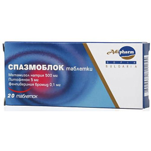 - Действующее вещество: МЕТАМИЗОЛ НАТРИЯ + ПИТОФЕНОН + ФЕНПИВЕРИНИЯ БРОМИД