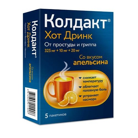 Активные компоненты: парацетамол 650 мг, фенирамина малеат 20 мг, фенилэфрина гидрохлорид 10 мг.