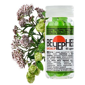 «Вечернее Биокор» – натуральное успокаивающее средство при нарушениях сна, состоянии тревожности на основе валерианы, мяты и хмеля.Благодаря природному комплексу трав драже «Вечернее Биокор» обладает мягким успокаивающим и спазмолитическим действием.